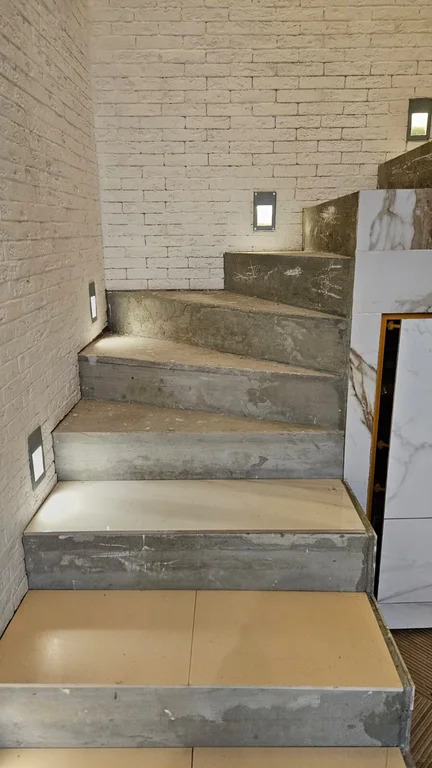 Стены: пеноблок, штукатурка, Пеноплекс 5, фасадная сетка, водостойкая шпаклёвка, фасадная моющаяся краска. Бетонная лестница, перекрытие бетон, арматура бетон, фундамент сваи 17.2 м.